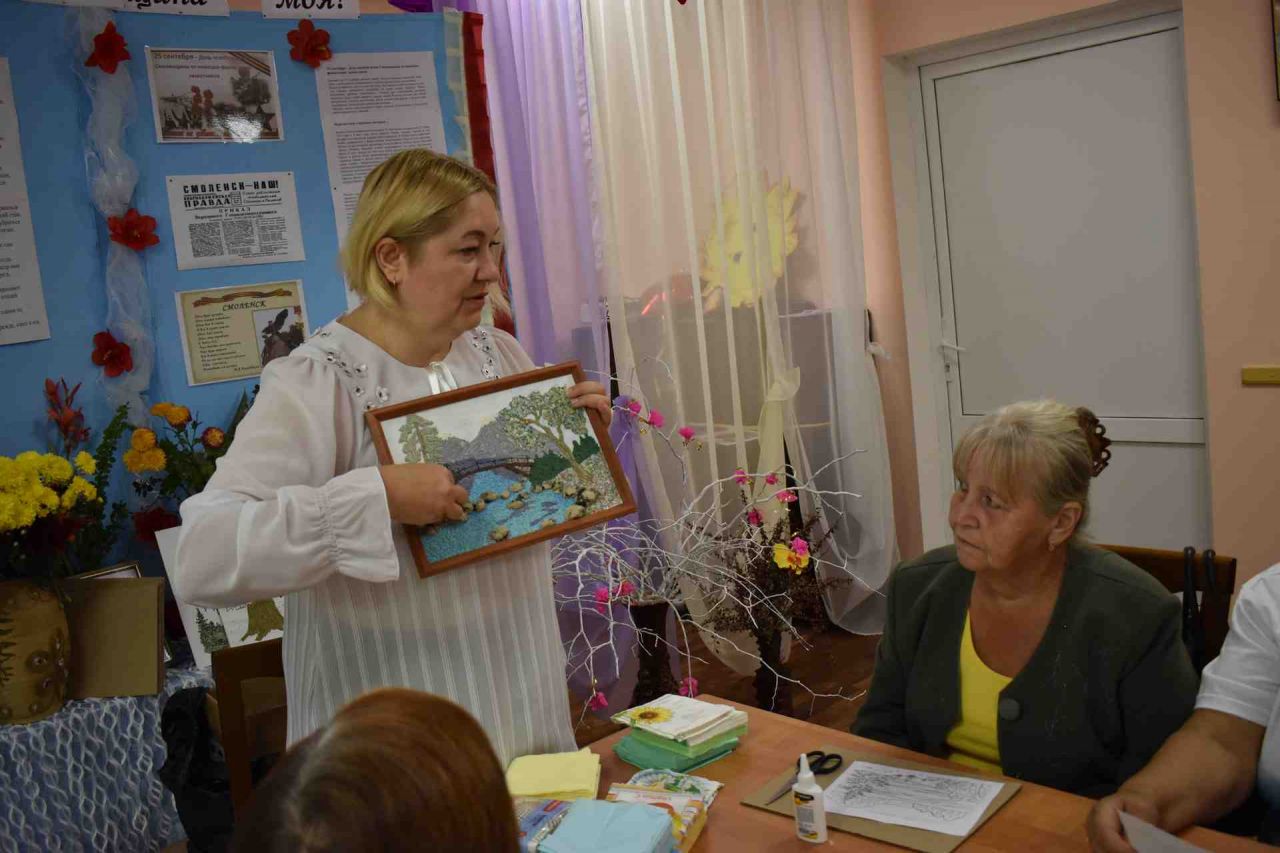 3,7и 9 октября участники КЗВ посетили кружок «Рукодельный дизайн» в котором прошел мастер- класс по изготовлению картин из бумажных салфеток «Смоленские просторы». Путем сминания кусочков бумажной салфетки кончиками пальцев, получаются комочки, которые используют для заполнения контура рисунка, приклеивая эти комочки на определенные места. Такие картины получаются красочные и объёмные выполненные аппликациями из салфеток.